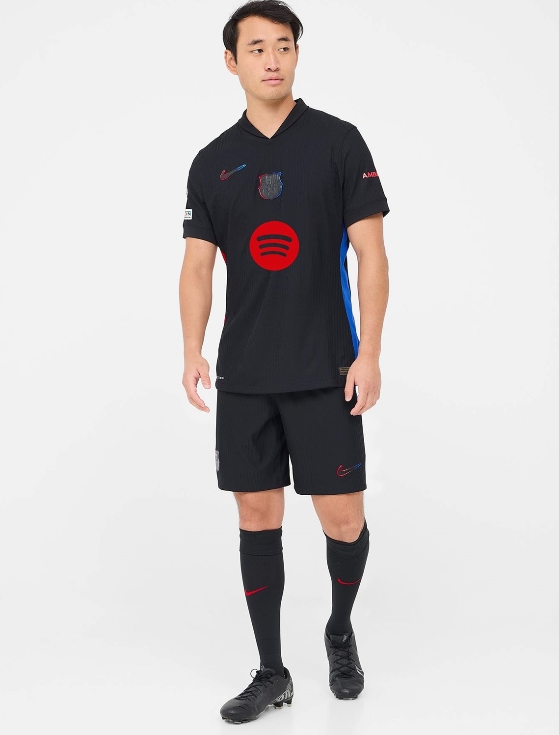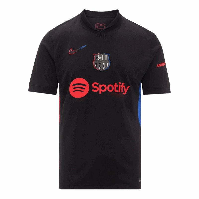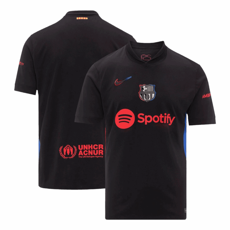 Let me introduce the new Barcelona Jersey Away 2024/25, available for size S,M,L,XL,2XL,3XL,4XL. Camiseta barcelona 2025 is designed into regular fit. This Barcelona jersey was officially released on July 18, 2024. The main color is black, and stripes on this Barcelona Jersey are specially designed into red and blue. This Barcelona Jersey is very similar to the iconic 1998-99 season Barcelona kit, which was used by Barcelona to commemorate their 100th anniversary, marking the 125th anniversary of the club's founding, and we can see the word '125' on the back of the Barcelona Jersey out of the collar. Moreover, Our uses lightweight polyester interlock fabrics to create a Barcelona jersey that mirrors the fit and feel of the Barcelona kit worn by Barcelona on the pitch. Machine washable. Turn the barcelona jersey away inside out to wash with cold water on a gentle cycle to prevent barcelona jersey 24/25 from fading. So let's get the camiseta del barcelona 2024/25 now!